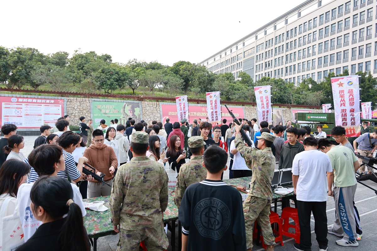 最后,啟動儀式在嘹亮的軍歌聲中圓滿結束。啟動儀式結束后,陽江校區聯合陽東區人武部在海納樓東側小廣場開展國防教育進校園活動。現場設立了國防教育展區、設備體驗區和政策咨詢區,吸引了眾多師生前來咨詢體驗,激發了同學們對部隊的興趣和參軍入伍意愿,大大增強了師生們的國防意識。