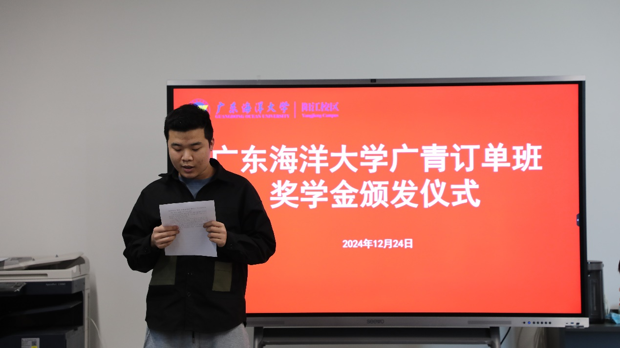 12月24日下午,廣東海洋大學廣青訂單班獎學金頒發儀式在陽江校區厚為樓408會議室舉行。廣東廣青金屬科技有限公司黨委副書記、工會主席王大慶出席儀式并頒獎。材料科學與工程學院黨總支書記李毅、副院長尹冬松出席活動。