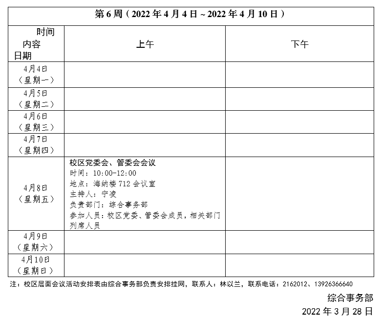 2021~2022學(xué)年第二學(xué)期第6周會議活動安排表