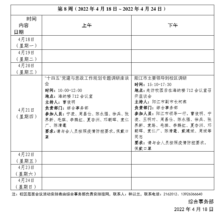 2021~2022學年第二學期第8周會議活動安排表