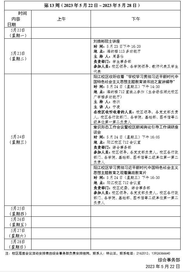 2022~2023學年第一學期第13周會議活動安排表