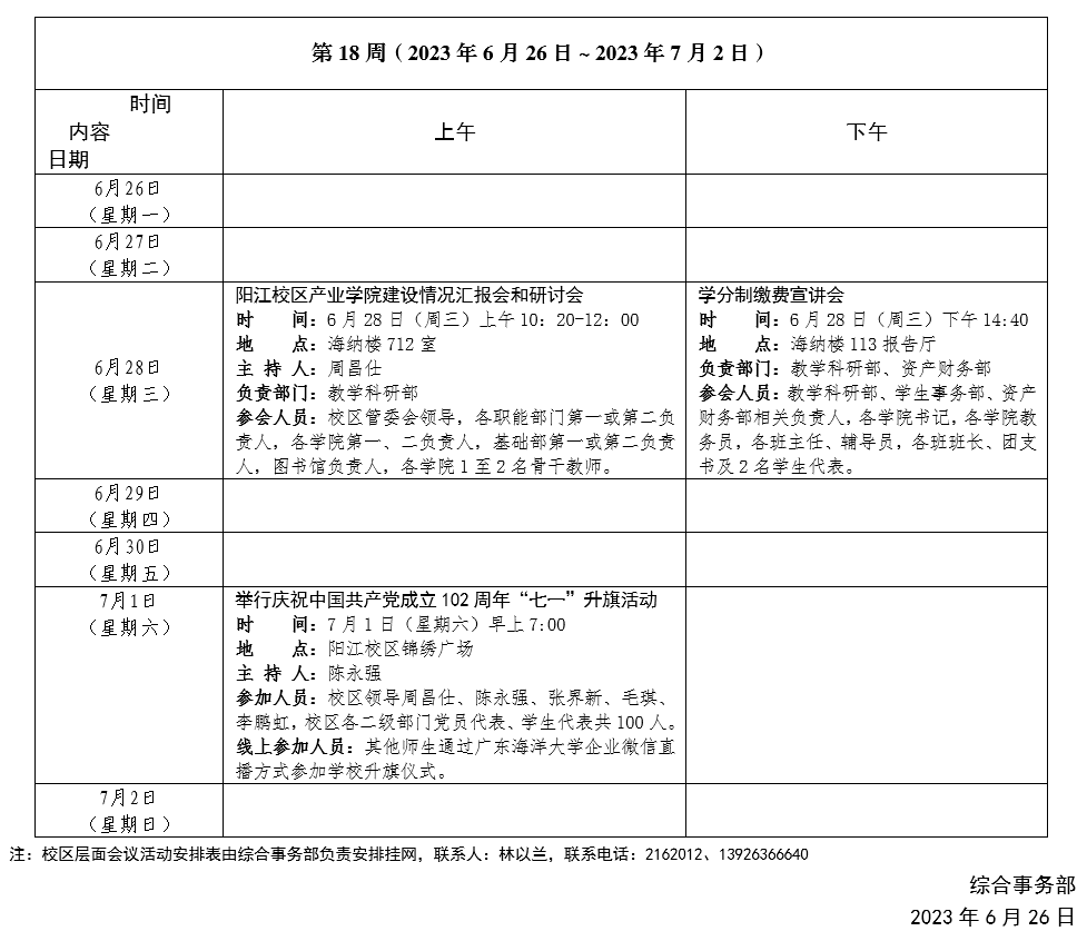 2022~2023學年第一學期第18周會?議活動安排表