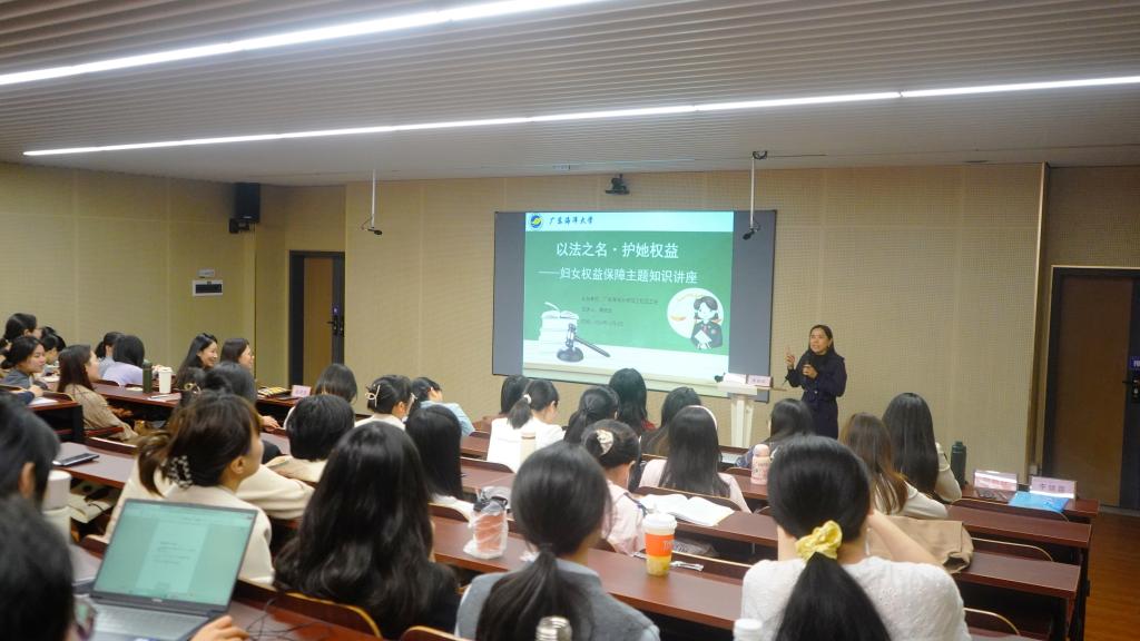 《以法之名,護她權(quán)益》主題講座的主講人、校區(qū)人文與教育學(xué)院專任教師黃斌斌,與在場女職工一起深入探討和分析婦女權(quán)益保障問題,通過學(xué)習(xí)《廣東省實施〈女職工勞動保護特別規(guī)定〉辦法》等法律法規(guī),女職工們對權(quán)益保護有了更深入的了解,從而進一步增強法律意識。