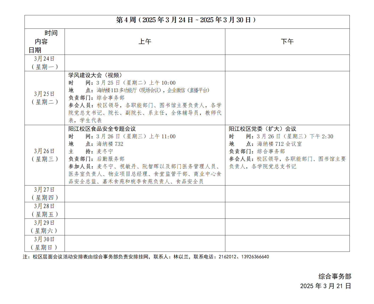 2024~2025學年第二學期第4周會議活動安排表
